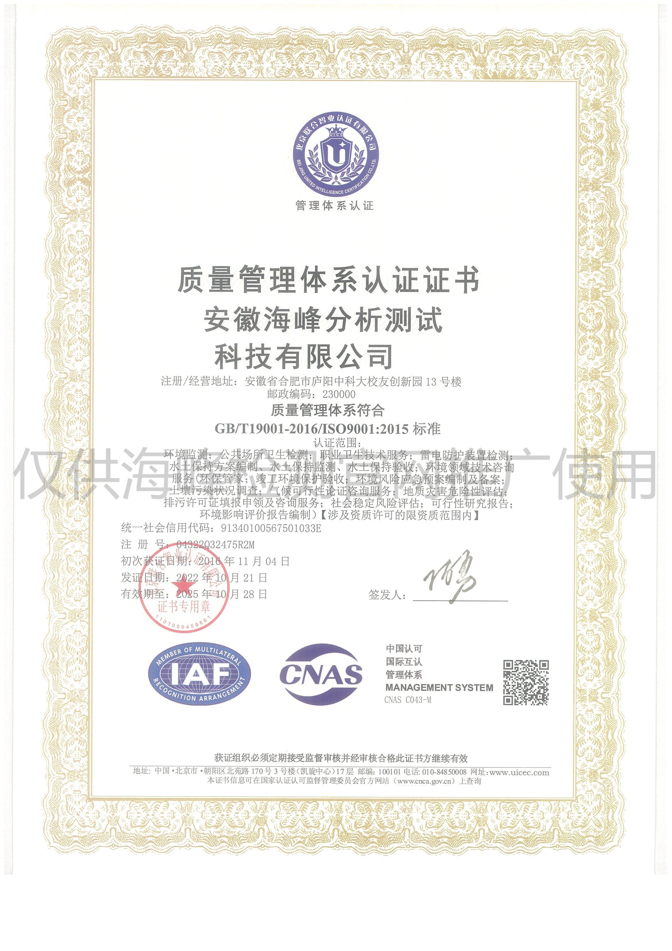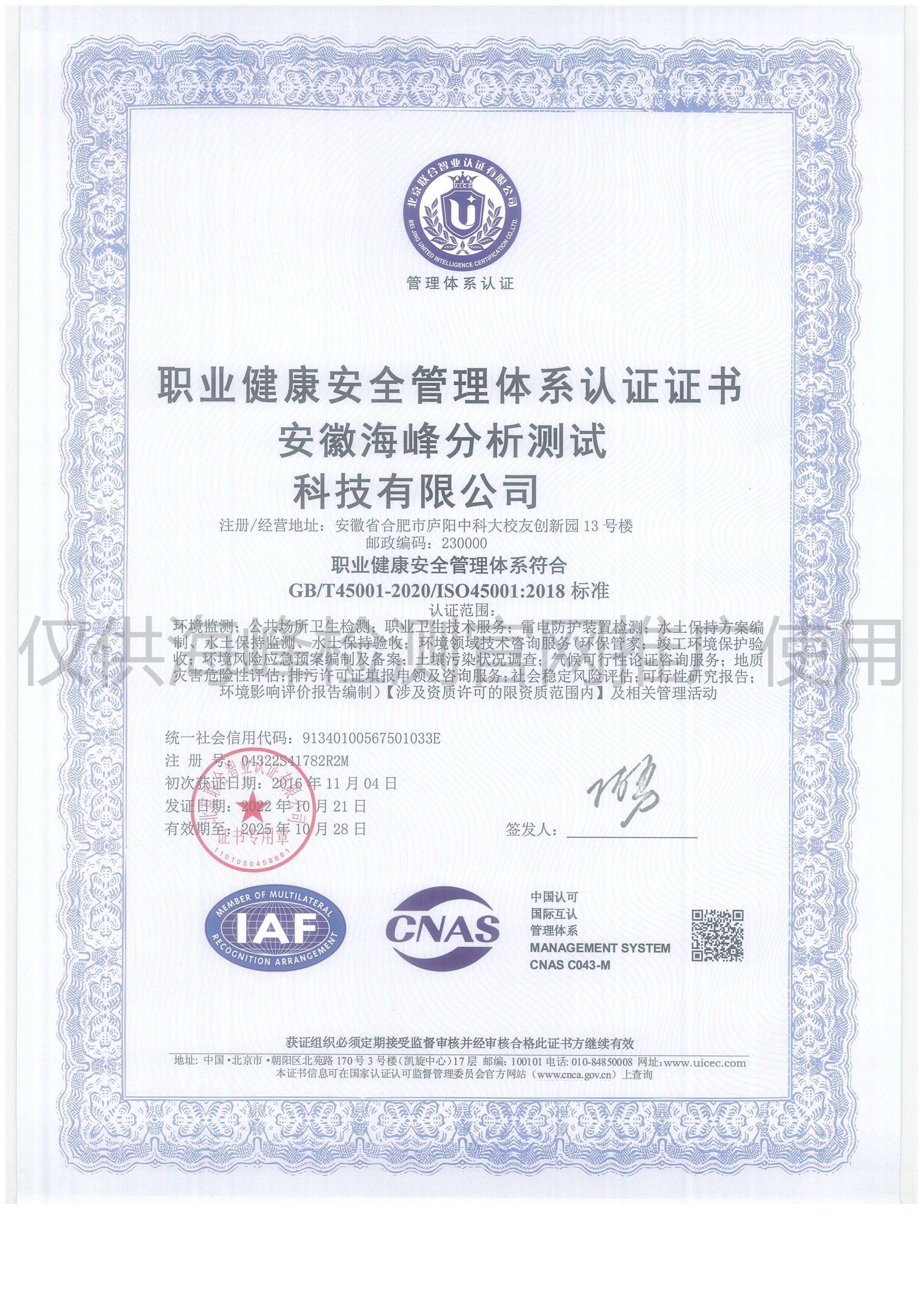 安徽海峰分析測試科技有限公司(以下簡稱海峰檢測)成立于2010 年,隸屬于安徽方中科技集團有限公司,公司下設安徽遠通檢測科技有限公司(安慶)、安徽安海新環境科技有限公司(亳州)。